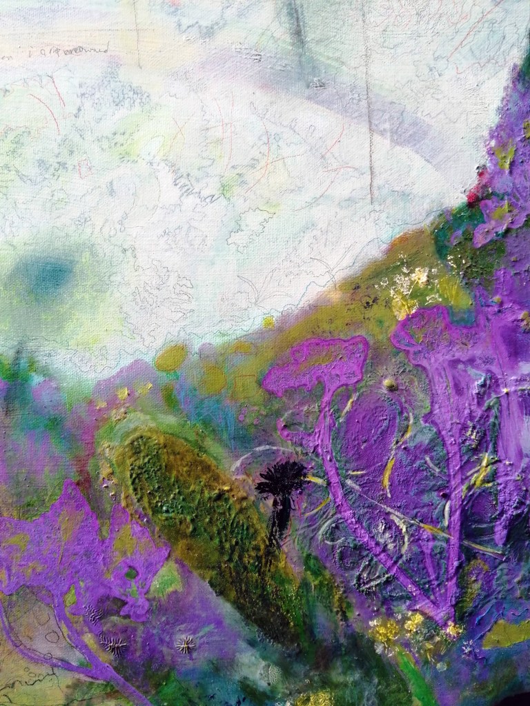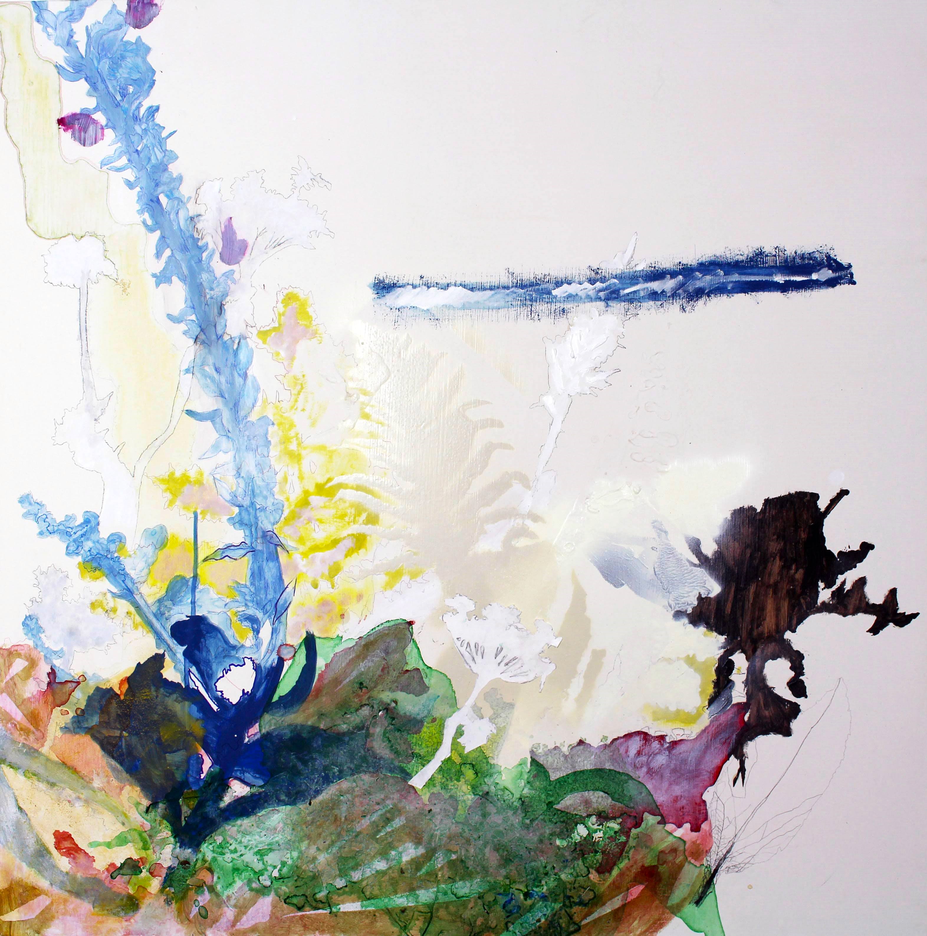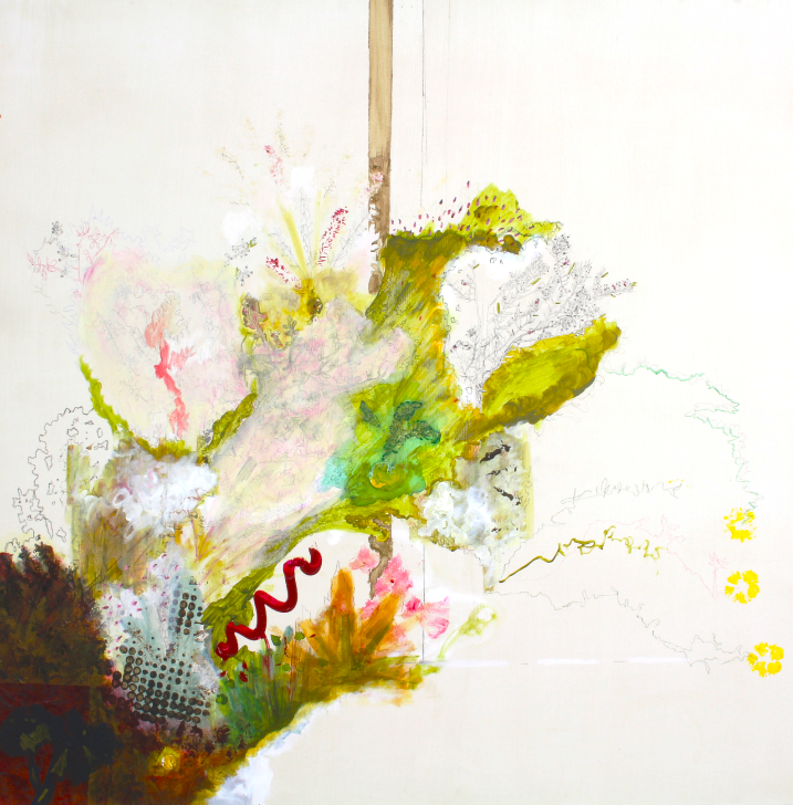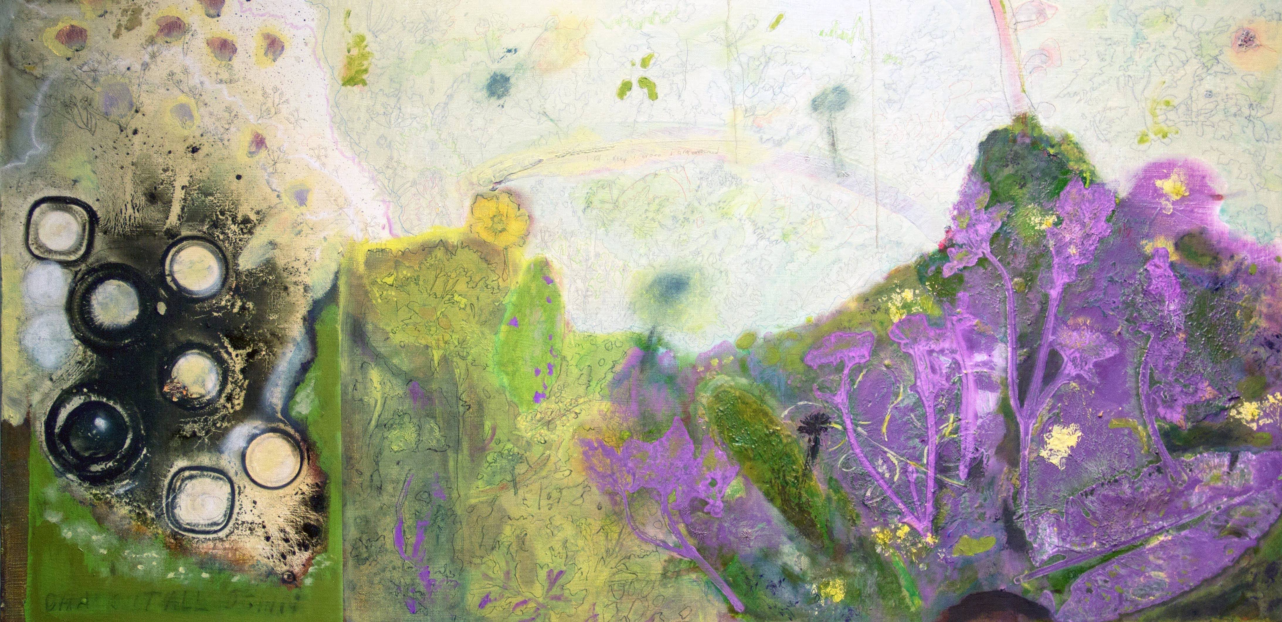 The work takes inspiration from the Greek primordial space Chaos, the great chasm from which life exploded and thoughts grew. Long has combined painting and drawing in order to emphasise the tumultuous origins of nature. The works act as terrains of many whims sparked by a variety of different texts, poems and stories. The viewer is invited to enter this fictional landscape.