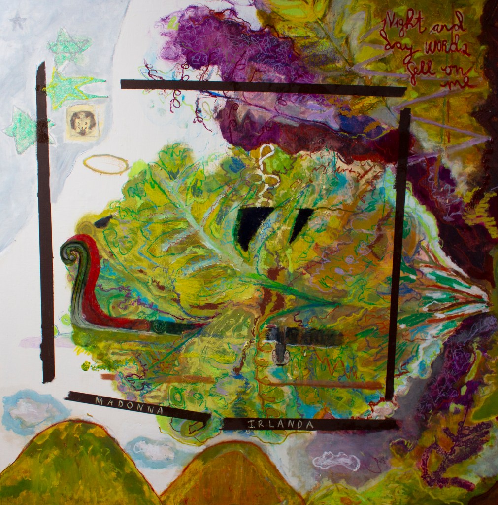 In the new painting series, Long combines these references with personal stories and motifs. She mixes religious iconography with handwritten lines of folk songs and the practice of daisy chain making that defined her girlhood. In I Rose Up and Told My Story, for instance, she invokes Michael Farrell’s painting Madonna Irlanda (1978), but replaces the image of the Vitruvian Man with a Síle na gig. She views this rearranging and reinterpreting of histories and visualities as an act of feminist fictioning.